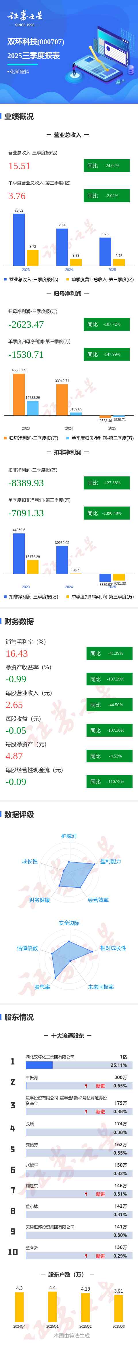 证券之星消息,双环科技2025年三季报显示,公司主营收入15.51亿元,同比下降24.03%;归母净利润-2623.47万元,同比下降107.73%;扣非净利润-8389.93万元,同比下降127.38%;其中2025年第三季度,公司单季度主营收入3.76亿元,同比下降2.03%;单季度归母净利润-1530.71万元,同比下降148.0%;单季度扣非净利润-7091.33万元,同比下降1390.49%;负债率49.01%,投资收益199.31万元,财务费用1501.44万元,毛利率16.43%。