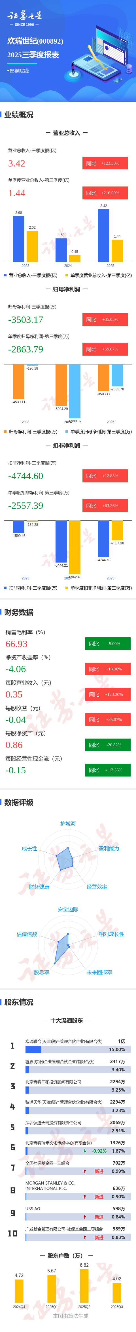 证券之星消息,欢瑞世纪2025年三季报显示,公司主营收入3.42亿元,同比上升123.3%;归母净利润-3503.17万元,同比上升35.06%;扣非净利润-4744.6万元,同比上升12.85%;其中2025年第三季度,公司单季度主营收入1.44亿元,同比上升216.9%;单季度归母净利润-2863.79万元,同比上升59.08%;单季度扣非净利润-2557.39万元,同比上升63.27%;负债率51.81%,投资收益257.57万元,财务费用424.0万元,毛利率66.93%。