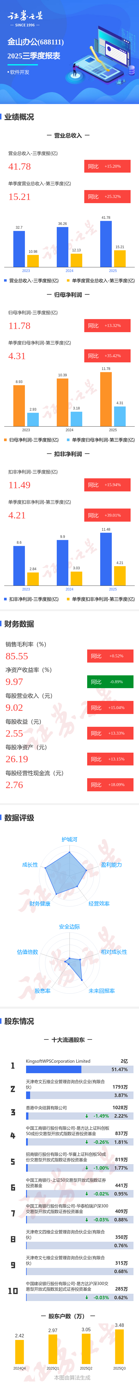 证券之星消息,金山办公2025年三季报显示,公司主营收入41.78亿元,同比上升15.21%;归母净利润11.78亿元,同比上升13.32%;扣非净利润11.49亿元,同比上升15.94%;其中2025年第三季度,公司单季度主营收入15.21亿元,同比上升25.33%;单季度归母净利润4.31亿元,同比上升35.42%;单季度扣非净利润4.21亿元,同比上升39.01%;负债率27.08%,投资收益2.02亿元,财务费用-186.72万元,毛利率85.55%。