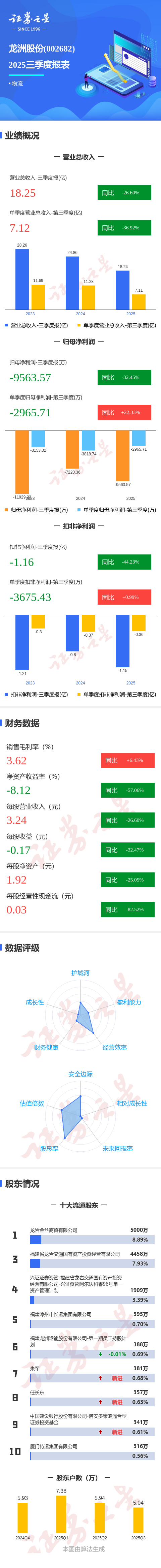 证券之星消息,龙洲股份2025年三季报显示,公司主营收入18.25亿元,同比下降26.61%;归母净利润-9563.57万元,同比下降32.45%;扣非净利润-1.16亿元,同比下降44.24%;其中2025年第三季度,公司单季度主营收入7.12亿元,同比下降36.92%;单季度归母净利润-2965.71万元,同比上升22.34%;单季度扣非净利润-3675.43万元,同比上升1.0%;负债率82.74%,投资收益-375.4万元,财务费用9440.56万元,毛利率3.62%。