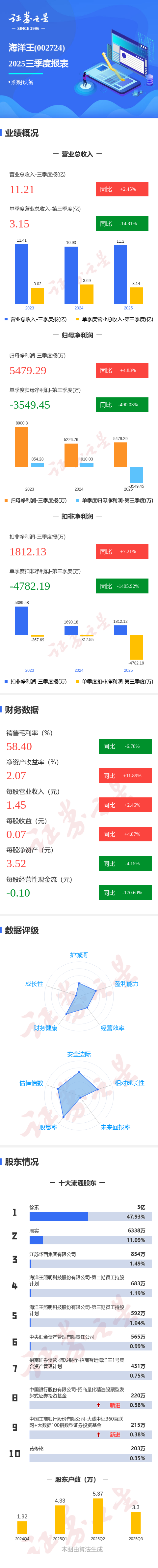 证券之星消息,海洋王2025年三季报显示,公司主营收入11.21亿元,同比上升2.46%;归母净利润5479.29万元,同比上升4.83%;扣非净利润1812.13万元,同比上升7.21%;其中2025年第三季度,公司单季度主营收入3.15亿元,同比下降14.81%;单季度归母净利润-3549.45万元,同比下降490.03%;单季度扣非净利润-4782.19万元,同比下降1405.92%;负债率17.42%,投资收益108.36万元,财务费用-160.23万元,毛利率58.4%。