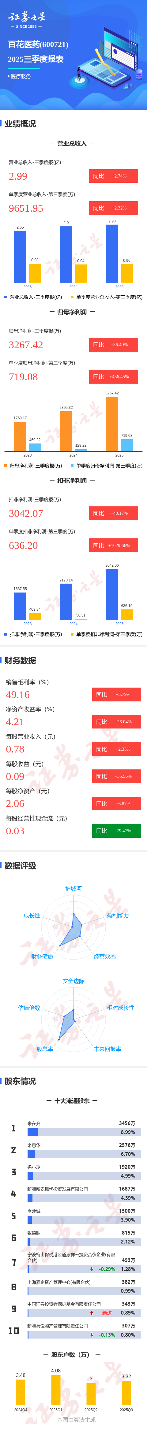 证券之星消息,百花医药2025年三季报显示,公司主营收入2.99亿元,同比上升2.74%;归母净利润3267.42万元,同比上升36.41%;扣非净利润3042.07万元,同比上升40.18%;其中2025年第三季度,公司单季度主营收入9651.95万元,同比上升2.32%;单季度归母净利润719.08万元,同比上升456.45%;单季度扣非净利润636.2万元,同比上升1029.67%;负债率29.16%,投资收益213.82万元,财务费用-81.29万元,毛利率49.16%。
