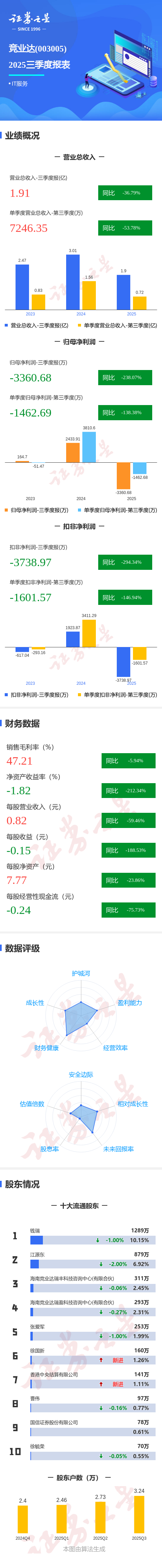 证券之星消息,竞业达2025年三季报显示,公司主营收入1.91亿元,同比下降36.79%;归母净利润-3360.68万元,同比下降238.08%;扣非净利润-3738.97万元,同比下降294.35%;其中2025年第三季度,公司单季度主营收入7246.35万元,同比下降53.79%;单季度归母净利润-1462.69万元,同比下降138.38%;单季度扣非净利润-1601.57万元,同比下降146.95%;负债率16.75%,投资收益429.04万元,财务费用-61.07万元,毛利率47.2%。