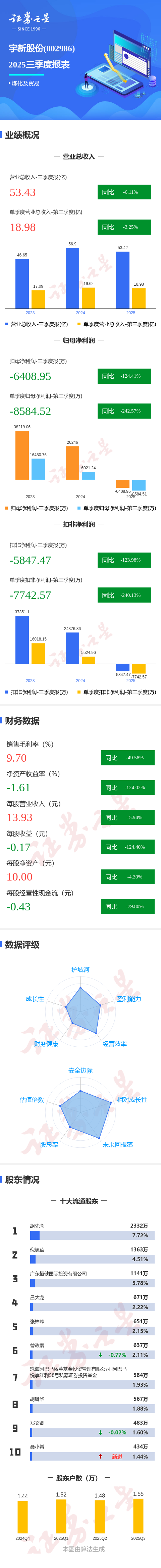 证券之星消息,宇新股份2025年三季报显示,公司主营收入53.43亿元,同比下降6.12%;归母净利润-6408.95万元,同比下降124.42%;扣非净利润-5847.47万元,同比下降123.99%;其中2025年第三季度,公司单季度主营收入18.98亿元,同比下降3.25%;单季度归母净利润-8584.52万元,同比下降242.57%;单季度扣非净利润-7742.57万元,同比下降240.14%;负债率59.19%,投资收益713.16万元,财务费用4811.94万元,毛利率9.7%。