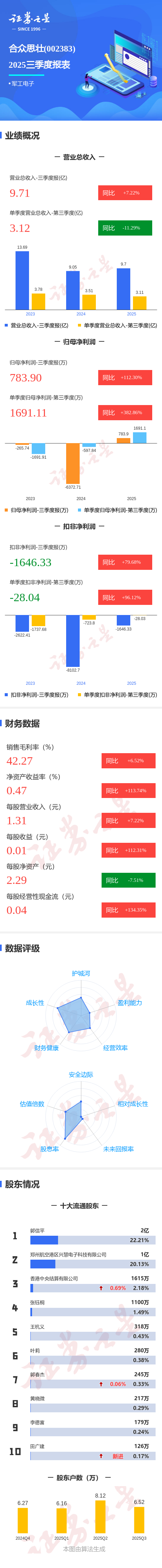 证券之星消息,合众思壮2025年三季报显示,公司主营收入9.71亿元,同比上升7.22%;归母净利润783.9万元,同比上升112.3%;扣非净利润-1646.33万元,同比上升79.68%;其中2025年第三季度,公司单季度主营收入3.12亿元,同比下降11.29%;单季度归母净利润1691.11万元,同比上升382.87%;单季度扣非净利润-28.04万元,同比上升96.13%;负债率42.4%,投资收益151.23万元,财务费用2043.51万元,毛利率42.27%。