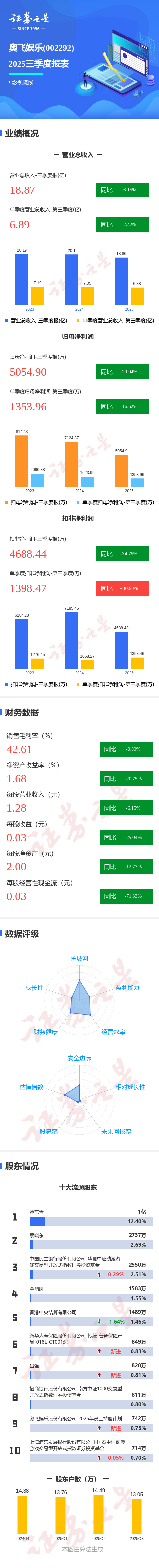 证券之星消息,奥飞娱乐2025年三季报显示,公司主营收入18.87亿元,同比下降6.16%;归母净利润5054.9万元,同比下降29.05%;扣非净利润4688.44万元,同比下降34.75%;其中2025年第三季度,公司单季度主营收入6.89亿元,同比下降2.42%;单季度归母净利润1353.96万元,同比下降16.63%;单季度扣非净利润1398.47万元,同比上升30.91%;负债率29.62%,投资收益-1505.64万元,财务费用157.14万元,毛利率42.61%。