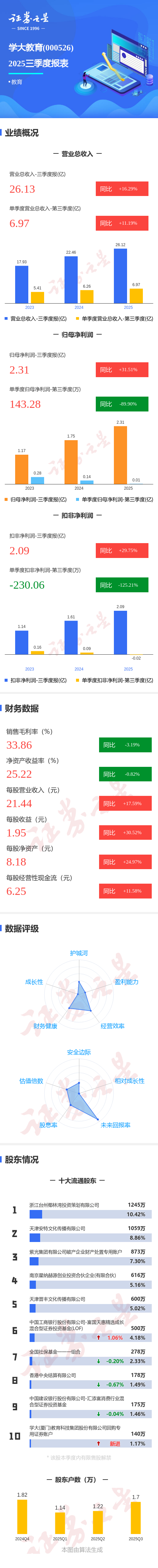 证券之星消息,学大教育2025年三季报显示,公司主营收入26.13亿元,同比上升16.3%;归母净利润2.31亿元,同比上升31.52%;扣非净利润2.09亿元,同比上升29.75%;其中2025年第三季度,公司单季度主营收入6.97亿元,同比上升11.19%;单季度归母净利润143.28万元,同比下降89.9%;单季度扣非净利润-230.06万元,同比下降125.21%;负债率77.09%,投资收益1364.29万元,财务费用4125.93万元,毛利率33.86%。