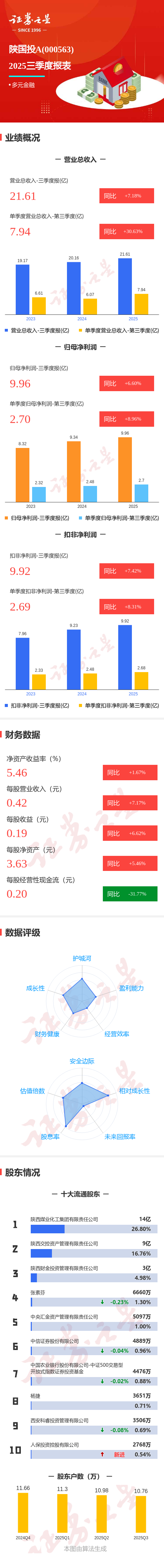 证券之星消息,陕国投A2025年三季报显示,公司主营收入21.61亿元,同比上升7.18%;归母净利润9.96亿元,同比上升6.6%;扣非净利润9.92亿元,同比上升7.43%;其中2025年第三季度,公司单季度主营收入7.94亿元,同比上升30.64%;单季度归母净利润2.7亿元,同比上升8.96%;单季度扣非净利润2.69亿元,同比上升8.32%;负债率34.34%,投资收益6.86亿元。