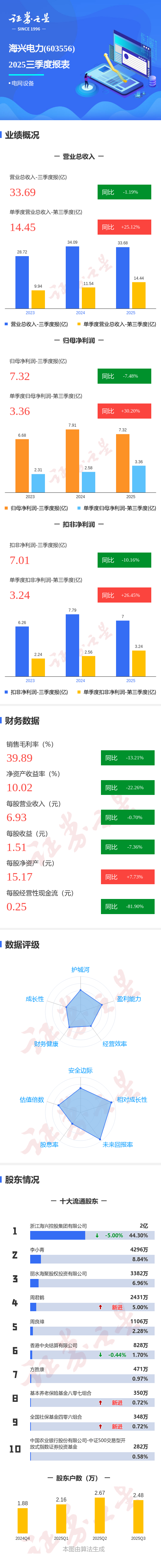 证券之星消息,海兴电力2025年三季报显示,公司主营收入33.69亿元,同比下降1.19%;归母净利润7.32亿元,同比下降7.48%;扣非净利润7.01亿元,同比下降10.16%;其中2025年第三季度,公司单季度主营收入14.45亿元,同比上升25.12%;单季度归母净利润3.36亿元,同比上升30.21%;单季度扣非净利润3.24亿元,同比上升26.45%;负债率24.69%,投资收益5683.09万元,财务费用-1.7亿元,毛利率39.89%。