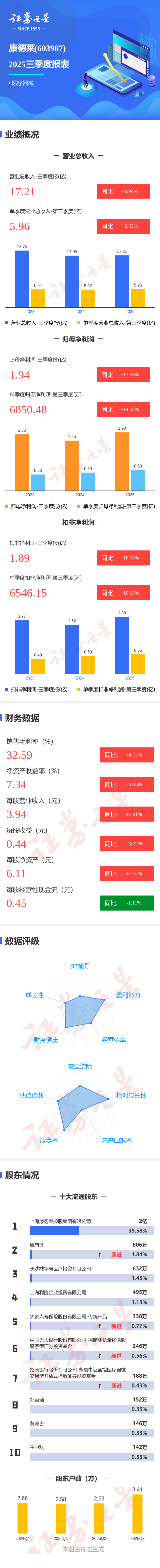 证券之星消息,康德莱2025年三季报显示,公司主营收入17.21亿元,同比上升0.95%;归母净利润1.94亿元,同比上升17.27%;扣非净利润1.89亿元,同比上升16.06%;其中2025年第三季度,公司单季度主营收入5.96亿元,同比上升2.44%;单季度归母净利润6850.48万元,同比上升14.33%;单季度扣非净利润6546.15万元,同比上升10.25%;负债率28.0%,投资收益3758.88万元,财务费用1082.49万元,毛利率32.59%。