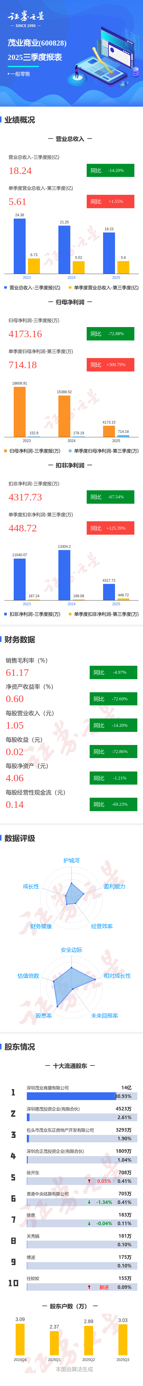 证券之星消息,茂业商业2025年三季报显示,公司主营收入18.24亿元,同比下降14.2%;归母净利润4173.16万元,同比下降72.88%;扣非净利润4317.73万元,同比下降67.55%;其中2025年第三季度,公司单季度主营收入5.61亿元,同比上升1.55%;单季度归母净利润714.18万元,同比上升300.79%;单季度扣非净利润448.72万元,同比上升125.39%;负债率58.22%,投资收益61.94万元,财务费用2.12亿元,毛利率61.17%。