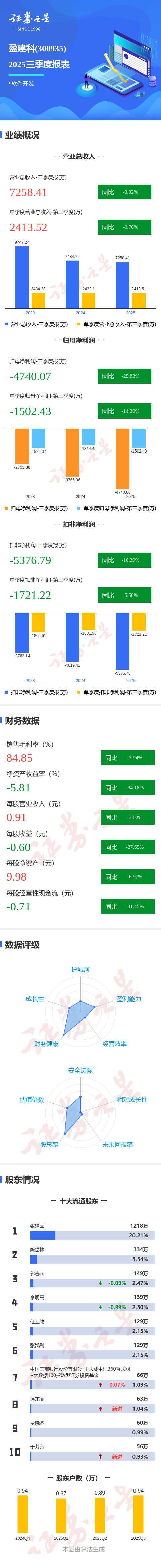 证券之星消息,盈建科2025年三季报显示,公司主营收入7258.41万元,同比下降3.02%;归母净利润-4740.07万元,同比下降25.83%;扣非净利润-5376.79万元,同比下降16.4%;其中2025年第三季度,公司单季度主营收入2413.52万元,同比下降0.76%;单季度归母净利润-1502.43万元,同比下降14.3%;单季度扣非净利润-1721.22万元,同比下降5.51%;负债率5.47%,投资收益410.08万元,财务费用-66.06万元,毛利率84.85%。