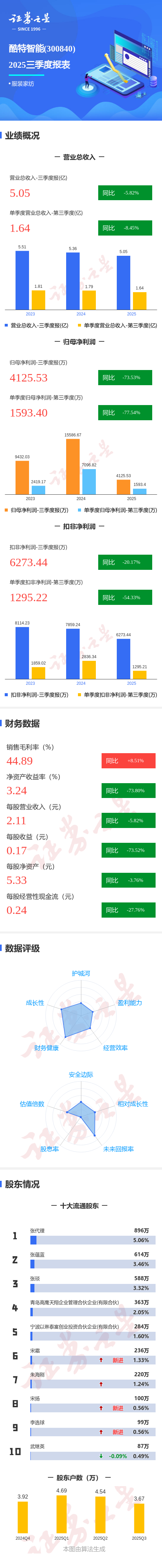 证券之星消息,酷特智能2025年三季报显示,公司主营收入5.05亿元,同比下降5.83%;归母净利润4125.53万元,同比下降73.53%;扣非净利润6273.44万元,同比下降20.18%;其中2025年第三季度,公司单季度主营收入1.64亿元,同比下降8.45%;单季度归母净利润1593.4万元,同比下降77.55%;单季度扣非净利润1295.22万元,同比下降54.33%;负债率18.89%,投资收益-2866.73万元,财务费用-354.22万元,毛利率44.89%。