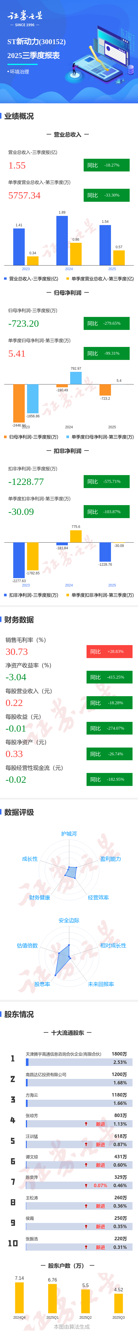 证券之星消息,ST新动力2025年三季报显示,公司主营收入1.55亿元,同比下降18.28%;归母净利润-723.2万元,同比下降279.65%;扣非净利润-1228.77万元,同比下降575.72%;其中2025年第三季度,公司单季度主营收入5757.34万元,同比下降33.31%;单季度归母净利润5.41万元,同比下降99.32%;单季度扣非净利润-30.09万元,同比下降103.88%;负债率68.44%,投资收益-141.58万元,财务费用267.1万元,毛利率30.73%。