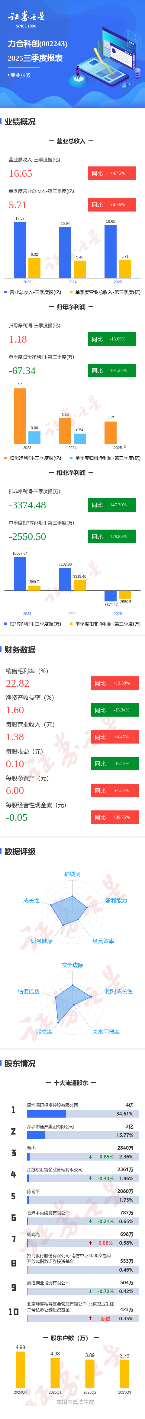 证券之星消息,力合科创2025年三季报显示,公司主营收入16.65亿元,同比上升4.46%;归母净利润1.18亿元,同比下降13.09%;扣非净利润-3374.48万元,同比下降147.31%;其中2025年第三季度,公司单季度主营收入5.71亿元,同比上升4.56%;单季度归母净利润-67.34万元,同比下降101.24%;单季度扣非净利润-2550.5万元,同比下降176.83%;负债率50.01%,投资收益1.79亿元,财务费用1.11亿元,毛利率22.82%。