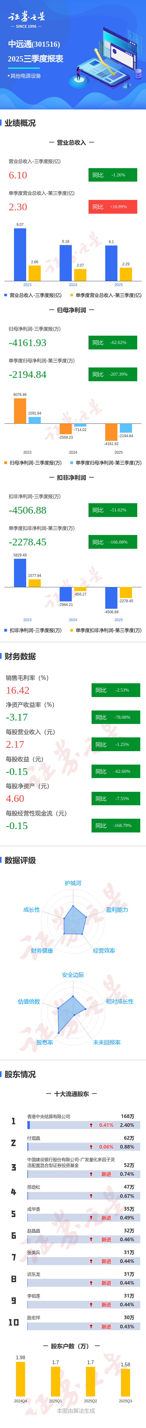 证券之星消息,中远通2025年三季报显示,公司主营收入6.1亿元,同比下降1.26%;归母净利润-4161.93万元,同比下降62.62%;扣非净利润-4506.88万元,同比下降51.02%;其中2025年第三季度,公司单季度主营收入2.3亿元,同比上升10.89%;单季度归母净利润-2194.84万元,同比下降207.39%;单季度扣非净利润-2278.45万元,同比下降166.09%;负债率24.17%,投资收益273.32万元,财务费用-97.73万元,毛利率16.42%。