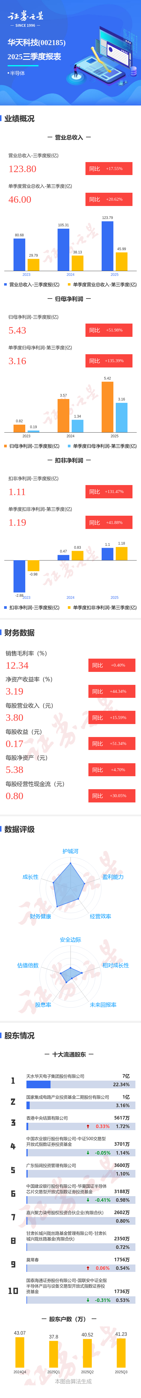 证券之星消息,华天科技2025年三季报显示,公司主营收入123.8亿元,同比上升17.55%;归母净利润5.43亿元,同比上升51.98%;扣非净利润1.11亿元,同比上升131.47%;其中2025年第三季度,公司单季度主营收入46.0亿元,同比上升20.63%;单季度归母净利润3.16亿元,同比上升135.4%;单季度扣非净利润1.19亿元,同比上升41.88%;负债率50.7%,投资收益1240.88万元,财务费用1.47亿元,毛利率12.34%。
