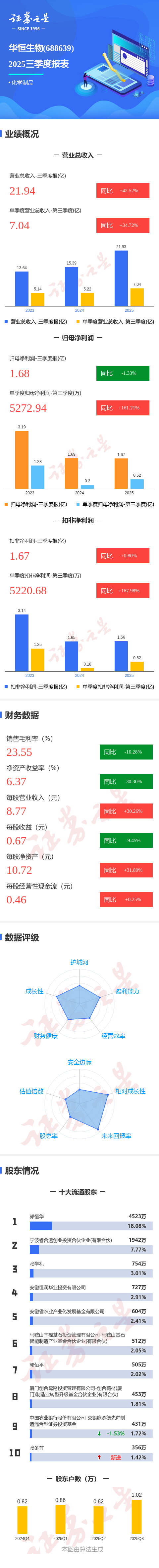 证券之星消息,华恒生物2025年三季报显示,公司主营收入21.94亿元,同比上升42.53%;归母净利润1.68亿元,同比下降1.34%;扣非净利润1.67亿元,同比上升0.8%;其中2025年第三季度,公司单季度主营收入7.04亿元,同比上升34.73%;单季度归母净利润5272.94万元,同比上升161.22%;单季度扣非净利润5220.68万元,同比上升187.98%;负债率52.96%,投资收益-161.75万元,财务费用2844.11万元,毛利率23.55%。
