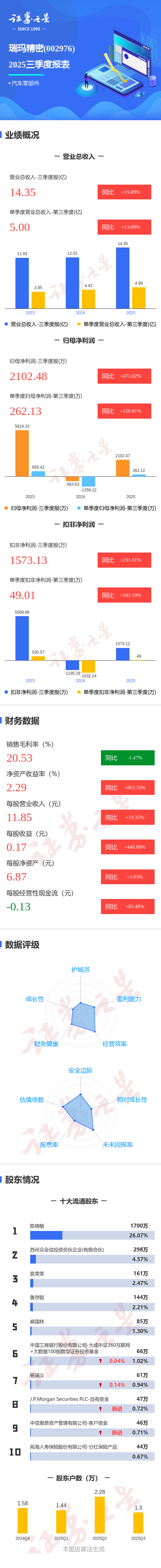 证券之星消息,瑞玛精密2025年三季报显示,公司主营收入14.35亿元,同比上升19.49%;归母净利润2102.48万元,同比上升473.02%;扣非净利润1573.13万元,同比上升231.61%;其中2025年第三季度,公司单季度主营收入5.0亿元,同比上升13.09%;单季度归母净利润262.13万元,同比上升120.82%;单季度扣非净利润49.01万元,同比上升103.2%;负债率64.32%,投资收益232.18万元,财务费用923.43万元,毛利率20.53%。