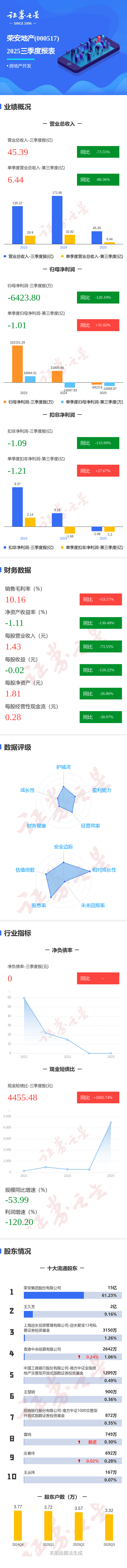 证券之星消息,荣安地产2025年三季报显示,公司主营收入45.39亿元,同比下降73.56%;归母净利润-6423.8万元,同比下降120.2%;扣非净利润-1.09亿元,同比下降133.99%;其中2025年第三季度,公司单季度主营收入6.44亿元,同比下降80.36%;单季度归母净利润-1.01亿元,同比上升31.02%;单季度扣非净利润-1.21亿元,同比上升27.68%;负债率55.13%,投资收益3354.83万元,财务费用5708.2万元,毛利率10.16%。