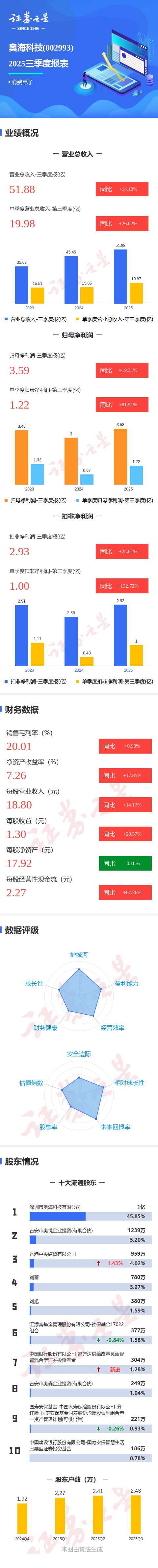 证券之星消息,奥海科技2025年三季报显示,公司主营收入51.88亿元,同比上升14.14%;归母净利润3.59亿元,同比上升19.32%;扣非净利润2.93亿元,同比上升24.62%;其中2025年第三季度,公司单季度主营收入19.98亿元,同比上升26.03%;单季度归母净利润1.22亿元,同比上升81.92%;单季度扣非净利润1.0亿元,同比上升132.72%;负债率45.54%,投资收益2916.91万元,财务费用589.05万元,毛利率20.01%。