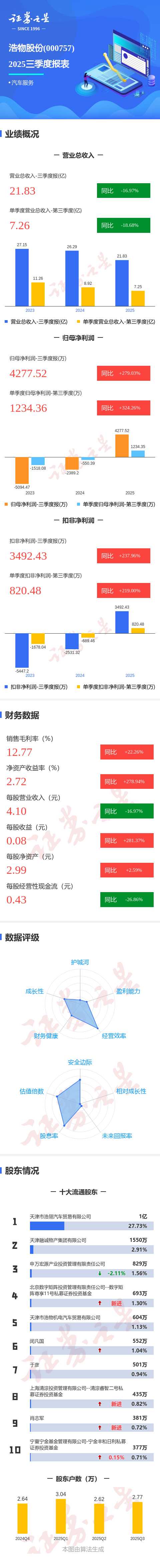 证券之星消息,浩物股份2025年三季报显示,公司主营收入21.83亿元,同比下降16.98%;归母净利润4277.52万元,同比上升279.04%;扣非净利润3492.43万元,同比上升237.97%;其中2025年第三季度,公司单季度主营收入7.26亿元,同比下降18.69%;单季度归母净利润1234.36万元,同比上升324.27%;单季度扣非净利润820.48万元,同比上升219.0%;负债率35.31%,投资收益-248.93万元,财务费用383.36万元,毛利率12.77%。