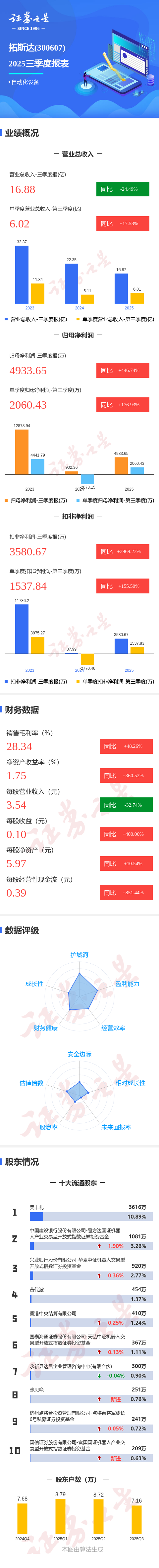 证券之星消息,拓斯达2025年三季报显示,公司主营收入16.88亿元,同比下降24.49%;归母净利润4933.65万元,同比上升446.75%;扣非净利润3580.67万元,同比上升3969.23%;其中2025年第三季度,公司单季度主营收入6.02亿元,同比上升17.58%;单季度归母净利润2060.43万元,同比上升176.93%;单季度扣非净利润1537.84万元,同比上升155.51%;负债率50.97%,投资收益74.18万元,财务费用708.63万元,毛利率28.34%。