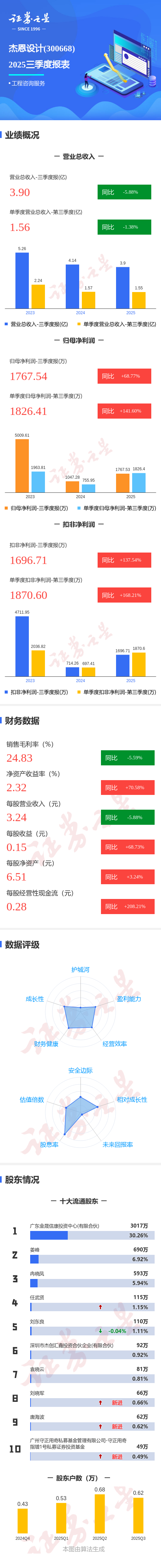 证券之星消息,杰恩设计2025年三季报显示,公司主营收入3.9亿元,同比下降5.88%;归母净利润1767.54万元,同比上升68.77%;扣非净利润1696.71万元,同比上升137.55%;其中2025年第三季度,公司单季度主营收入1.56亿元,同比下降1.39%;单季度归母净利润1826.41万元,同比上升141.6%;单季度扣非净利润1870.6万元,同比上升168.22%;负债率31.89%,投资收益-4.34万元,财务费用-55.8万元,毛利率24.83%。