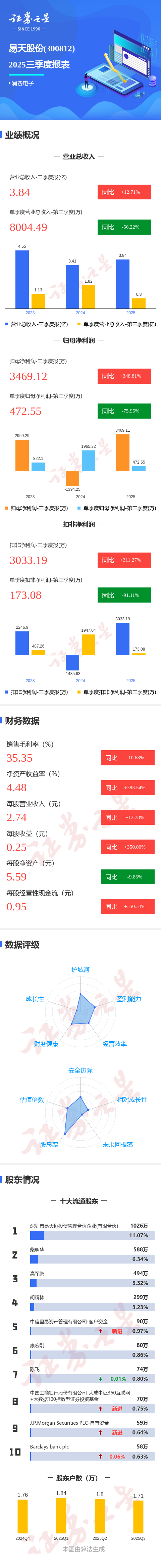 证券之星消息,易天股份2025年三季报显示,公司主营收入3.84亿元,同比上升12.71%;归母净利润3469.12万元,同比上升348.82%;扣非净利润3033.19万元,同比上升311.28%;其中2025年第三季度,公司单季度主营收入8004.49万元,同比下降56.23%;单季度归母净利润472.55万元,同比下降75.96%;单季度扣非净利润173.08万元,同比下降91.11%;负债率46.49%,投资收益57.02万元,财务费用111.71万元,毛利率35.35%。