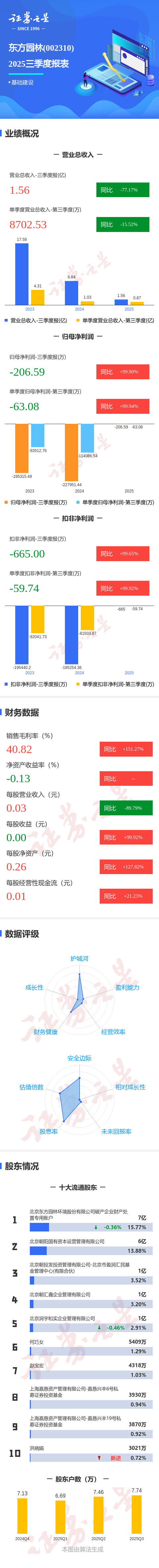 证券之星消息,东方园林2025年三季报显示,公司主营收入1.56亿元,同比下降77.18%;归母净利润-206.59万元,同比上升99.91%;扣非净利润-665.0万元,同比上升99.66%;其中2025年第三季度,公司单季度主营收入8702.53万元,同比下降15.53%;单季度归母净利润-63.08万元,同比上升99.94%;单季度扣非净利润-59.74万元,同比上升99.93%;负债率54.47%,投资收益321.44万元,财务费用3795.86万元,毛利率40.82%。