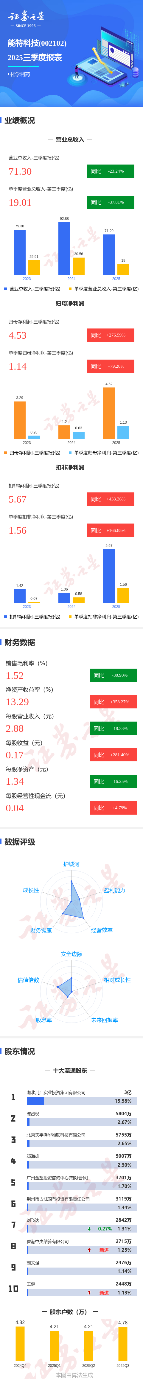 证券之星消息,能特科技2025年三季报显示,公司主营收入71.3亿元,同比下降23.24%;归母净利润4.53亿元,同比上升276.59%;扣非净利润5.67亿元,同比上升433.36%;其中2025年第三季度,公司单季度主营收入19.01亿元,同比下降37.82%;单季度归母净利润1.14亿元,同比上升79.29%;单季度扣非净利润1.56亿元,同比上升166.85%;负债率48.29%,投资收益5.57亿元,财务费用1983.08万元,毛利率1.52%。