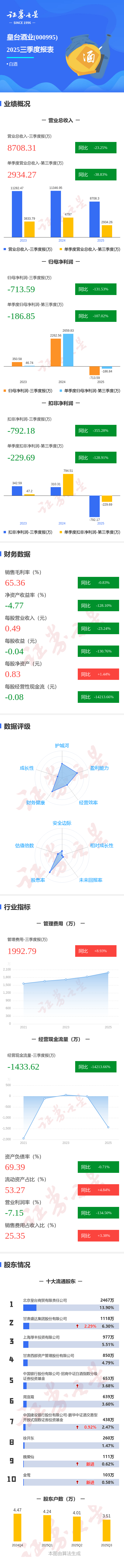 证券之星消息,皇台酒业2025年三季报显示,公司主营收入8708.31万元,同比下降23.25%;归母净利润-713.59万元,同比下降131.54%;扣非净利润-792.18万元,同比下降355.28%;其中2025年第三季度,公司单季度主营收入2934.27万元,同比下降38.83%;单季度归母净利润-186.85万元,同比下降107.02%;单季度扣非净利润-229.69万元,同比下降128.91%;负债率69.39%,财务费用522.73万元,毛利率65.36%。