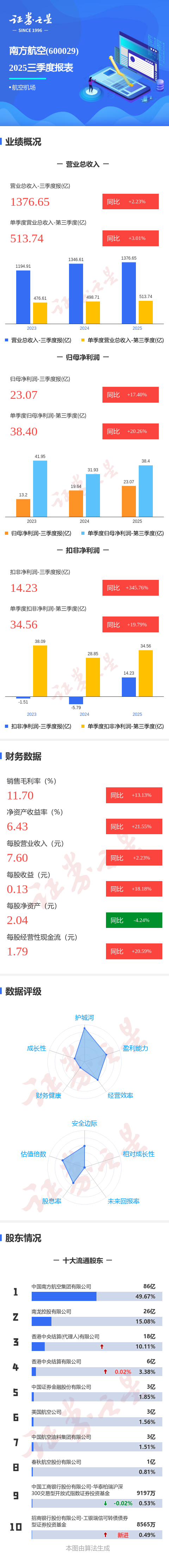 证券之星消息,南方航空2025年三季报显示,公司主营收入1376.65亿元,同比上升2.23%;归母净利润23.07亿元,同比上升17.4%;扣非净利润14.23亿元,同比上升345.77%;其中2025年第三季度,公司单季度主营收入513.74亿元,同比上升3.01%;单季度归母净利润38.4亿元,同比上升20.26%;单季度扣非净利润34.56亿元,同比上升19.79%;负债率83.39%,投资收益-1.05亿元,财务费用40.54亿元,毛利率11.7%。
