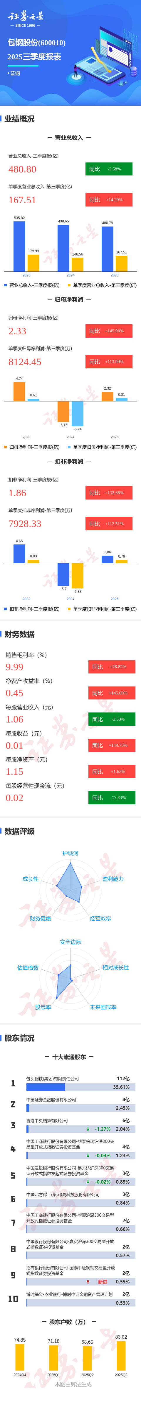 证券之星消息,包钢股份2025年三季报显示,公司主营收入480.8亿元,同比下降3.58%;归母净利润2.33亿元,同比上升145.03%;扣非净利润1.86亿元,同比上升132.67%;其中2025年第三季度,公司单季度主营收入167.51亿元,同比上升14.29%;单季度归母净利润8124.45万元,同比上升113.01%;单季度扣非净利润7928.33万元,同比上升112.51%;负债率60.46%,投资收益1.31亿元,财务费用14.43亿元,毛利率9.99%。