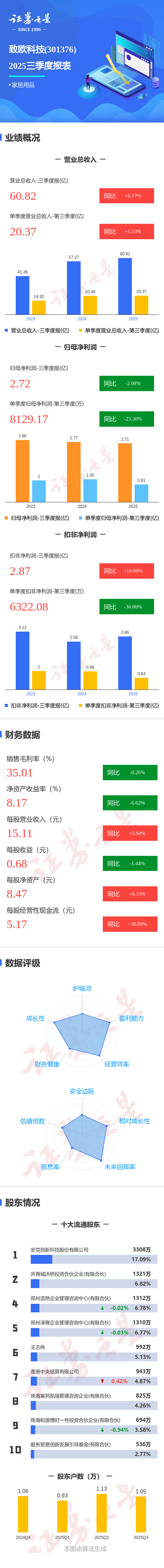 证券之星消息,致欧科技2025年三季报显示,公司主营收入60.82亿元,同比上升6.18%;归母净利润2.72亿元,同比下降2.09%;扣非净利润2.87亿元,同比上升11.0%;其中2025年第三季度,公司单季度主营收入20.37亿元,同比上升1.53%;单季度归母净利润8129.17万元,同比下降23.31%;单季度扣非净利润6322.08万元,同比下降36.0%;负债率47.04%,投资收益4292.94万元,财务费用-5637.51万元,毛利率35.01%。