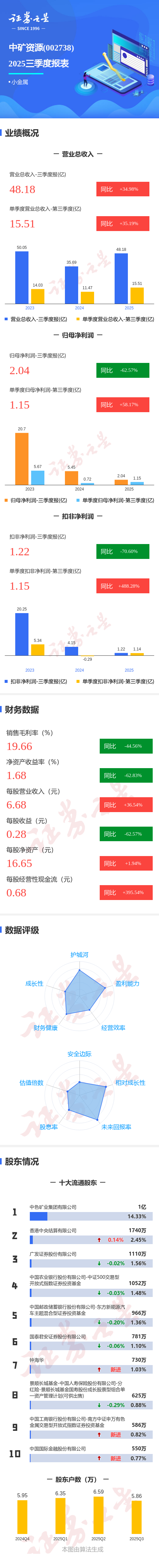 证券之星消息,中矿资源2025年三季报显示,公司主营收入48.18亿元,同比上升34.99%;归母净利润2.04亿元,同比下降62.58%;扣非净利润1.22亿元,同比下降70.6%;其中2025年第三季度,公司单季度主营收入15.51亿元,同比上升35.19%;单季度归母净利润1.15亿元,同比上升58.18%;单季度扣非净利润1.15亿元,同比上升488.28%;负债率32.35%,投资收益1533.82万元,财务费用7930.79万元,毛利率19.66%。