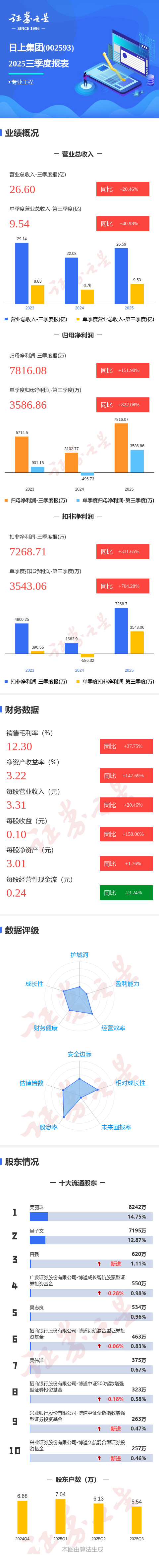 证券之星消息,日上集团2025年三季报显示,公司主营收入26.6亿元,同比上升20.46%;归母净利润7816.08万元,同比上升151.91%;扣非净利润7268.71万元,同比上升331.66%;其中2025年第三季度,公司单季度主营收入9.54亿元,同比上升40.99%;单季度归母净利润3586.86万元,同比上升822.09%;单季度扣非净利润3543.06万元,同比上升704.28%;负债率48.32%,投资收益197.63万元,财务费用2190.08万元,毛利率12.3%。