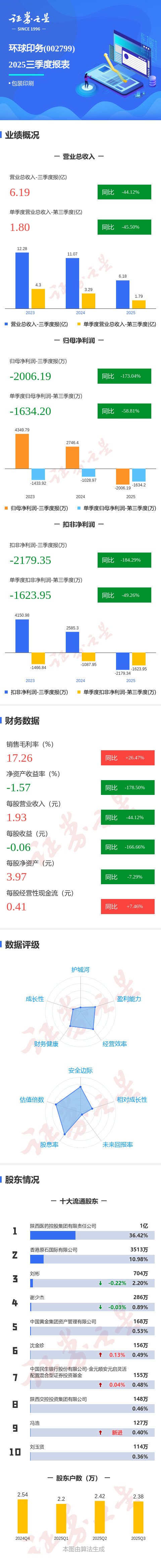 证券之星消息,环球印务2025年三季报显示,公司主营收入6.19亿元,同比下降44.12%;归母净利润-2006.19万元,同比下降173.05%;扣非净利润-2179.35万元,同比下降184.3%;其中2025年第三季度,公司单季度主营收入1.8亿元,同比下降45.51%;单季度归母净利润-1634.2万元,同比下降58.82%;单季度扣非净利润-1623.95万元,同比下降49.27%;负债率30.57%,投资收益415.73万元,财务费用500.78万元,毛利率17.26%。