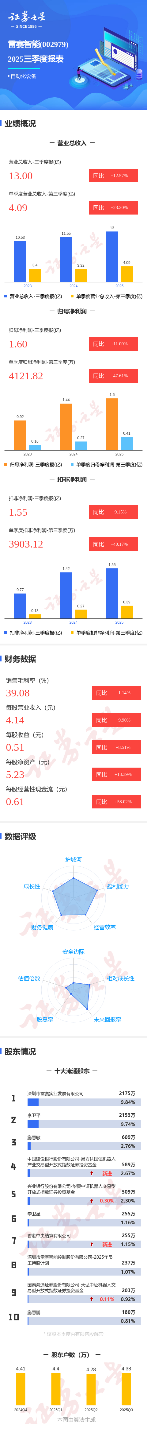 证券之星消息,雷赛智能2025年三季报显示,公司主营收入13.0亿元,同比上升12.57%;归母净利润1.6亿元,同比上升11.01%;扣非净利润1.55亿元,同比上升9.16%;其中2025年第三季度,公司单季度主营收入4.09亿元,同比上升23.21%;单季度归母净利润4121.82万元,同比上升47.62%;单季度扣非净利润3903.12万元,同比上升40.17%;负债率40.9%,投资收益616.81万元,财务费用350.44万元,毛利率39.08%。
