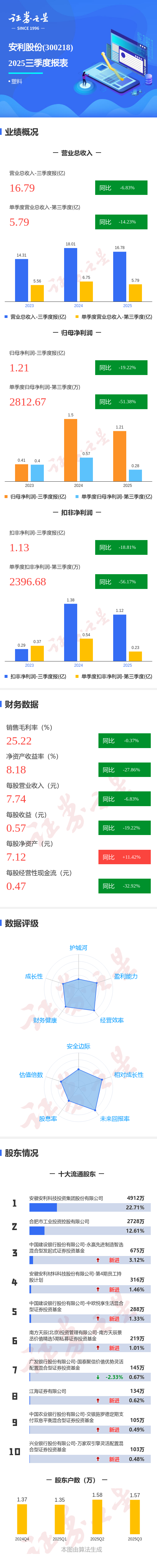 证券之星消息,安利股份2025年三季报显示,公司主营收入16.79亿元,同比下降6.84%;归母净利润1.21亿元,同比下降19.22%;扣非净利润1.13亿元,同比下降18.81%;其中2025年第三季度,公司单季度主营收入5.79亿元,同比下降14.24%;单季度归母净利润2812.67万元,同比下降51.38%;单季度扣非净利润2396.68万元,同比下降56.17%;负债率30.67%,投资收益-175.8万元,财务费用349.91万元,毛利率25.22%。