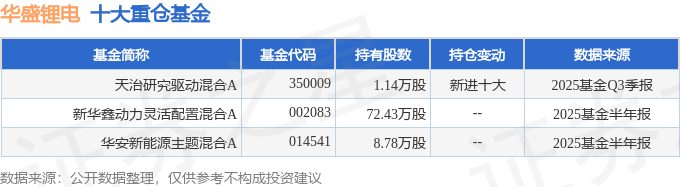 持有华盛锂电最多的基金为天治研究驱动混合A,目前规模为0.21亿元,最新净值1.7431(10月27日),较上一交易日上涨2.22%,近一年上涨3.83%。该基金现任基金经理为梁莉。
