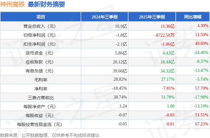 据证券之星公开数据整理,近期神州高铁(000008)发布2025年三季报。截至本报告期末,公司营业总收入11.36亿元,同比上升4.3%,归母净利润-8722.58万元,同比上升51.5%。按单季度数据看,第三季度营业总收入5.64亿元,同比上升0.29%,第三季度归母净利润774.31万元,同比上升246.24%。本报告期神州高铁短期债务压力上升,流动比率达0.89。