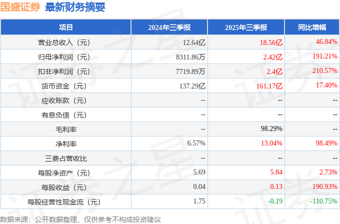据证券之星公开数据整理,近期国盛证券(002670)发布2025年三季报。根据财报显示,国盛证券营收净利润同比双双增长。截至本报告期末,公司营业总收入18.56亿元,同比上升46.84%,归母净利润2.42亿元,同比上升191.21%。按单季度数据看,第三季度营业总收入7.2亿元,同比上升78.17%,第三季度归母净利润3280.08万元,同比下降15.0%。