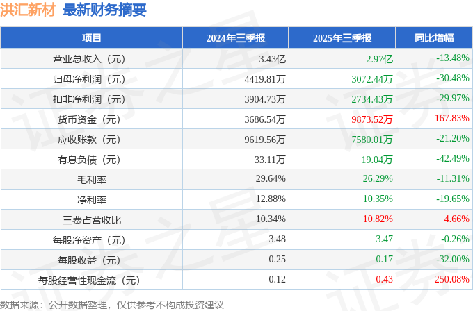据证券之星公开数据整理,近期洪汇新材(002802)发布2025年三季报。截至本报告期末,公司营业总收入2.97亿元,同比下降13.48%,归母净利润3072.44万元,同比下降30.48%。按单季度数据看,第三季度营业总收入1.0亿元,同比下降24.84%,第三季度归母净利润937.86万元,同比下降45.26%。本报告期洪汇新材公司应收账款体量较大,当期应收账款占最新年报归母净利润比达127.95%。