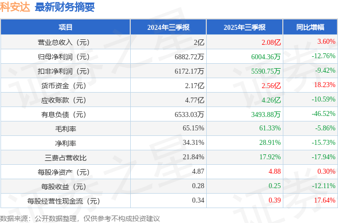 据证券之星公开数据整理,近期科安达(002972)发布2025年三季报。截至本报告期末,公司营业总收入2.08亿元,同比上升3.6%,归母净利润6004.36万元,同比下降12.76%。按单季度数据看,第三季度营业总收入4708.57万元,同比下降17.99%,第三季度归母净利润835.33万元,同比下降33.95%。本报告期科安达公司应收账款体量较大,当期应收账款占最新年报归母净利润比达483.82%。