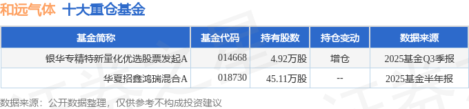 持有和远气体最多的基金为银华专精特新量化优选股票发起A,目前规模为0.81亿元,最新净值1.4433(10月27日),较上一交易日上涨0.83%,近一年上涨52.33%。该基金现任基金经理为杨腾。