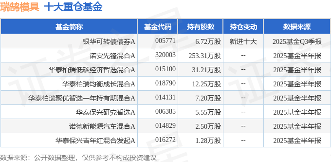 持有瑞鹄模具最多的基金为银华可转债债券A,目前规模为4.59亿元,最新净值1.6402(10月27日),较上一交易日上涨1.26%,近一年上涨27.61%。该基金现任基金经理为孙慧。