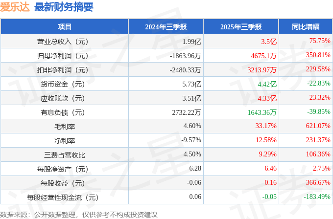 据证券之星公开数据整理,近期爱乐达(300696)发布2025年三季报。截至本报告期末,公司营业总收入3.5亿元,同比上升75.75%,归母净利润4675.1万元,同比上升350.81%。按单季度数据看,第三季度营业总收入1.22亿元,同比上升97.93%,第三季度归母净利润3643.7万元,同比上升3562.28%。本报告期爱乐达盈利能力上升,毛利率同比增幅621.07%,净利率同比增幅231.37%。