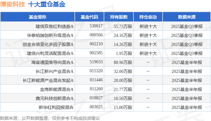 持有博俊科技最多的基金为建信双息红利债券A,目前规模为19.65亿元,最新净值1.273(10月27日),较上一交易日上涨0.55%,近一年上涨21.15%。该基金现任基金经理为尹润泉。