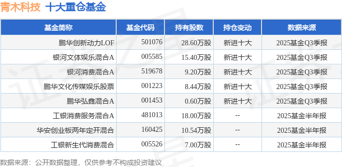 持有青木科技最多的基金为鹏华创新动力LOF,目前规模为3.19亿元,最新净值1.8218(10月27日),较上一交易日上涨1.78%,近一年上涨22.87%。该基金现任基金经理为李韵怡 萧嘉倩。